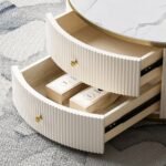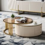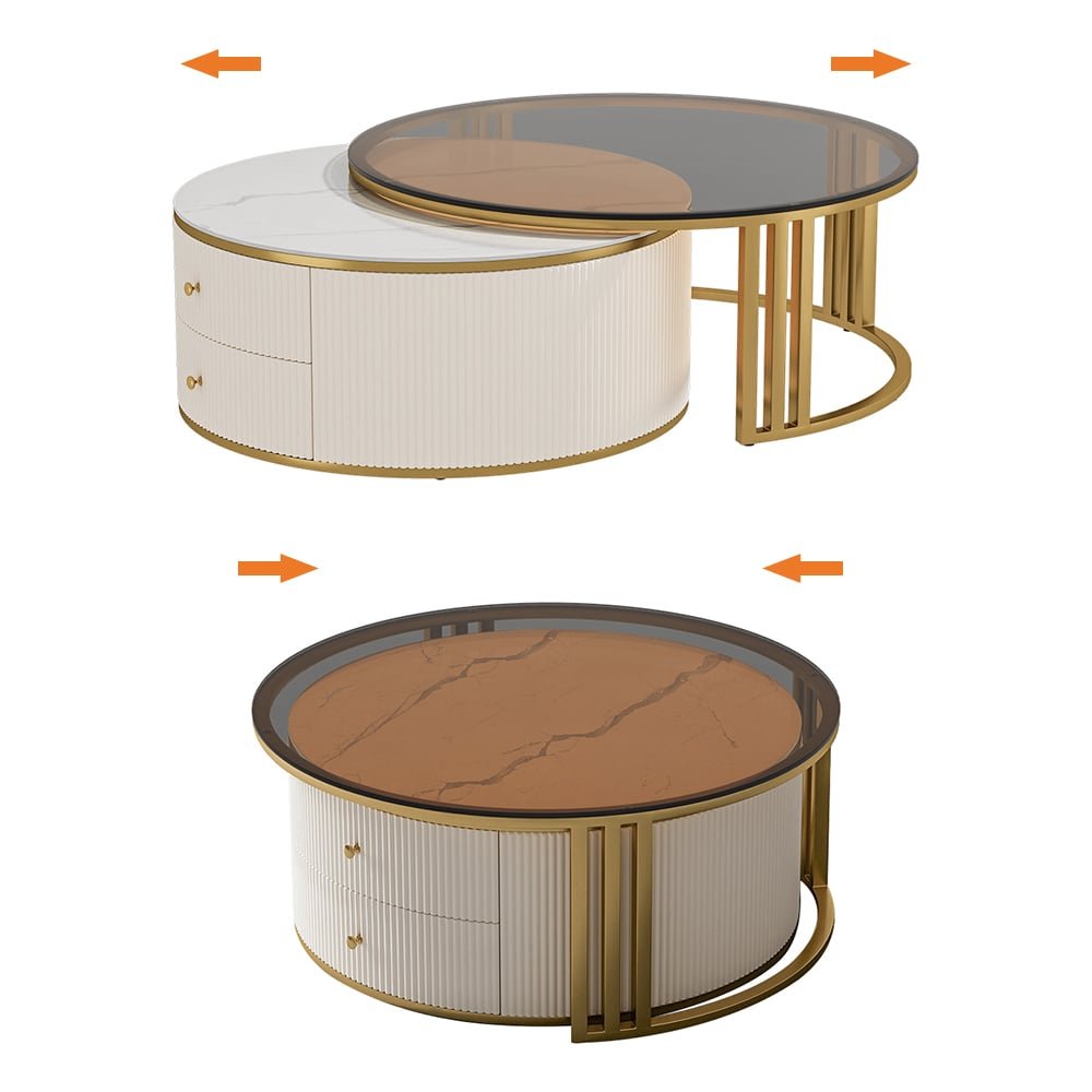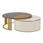 This elegant coffee table set combines modern style with functionality. It features a unique rotating design and built-in storage. The sleek glass top, ribbed surface, and gold accents make it a standout piece in any living room. Its nesting function saves space while maintaining a chic look.